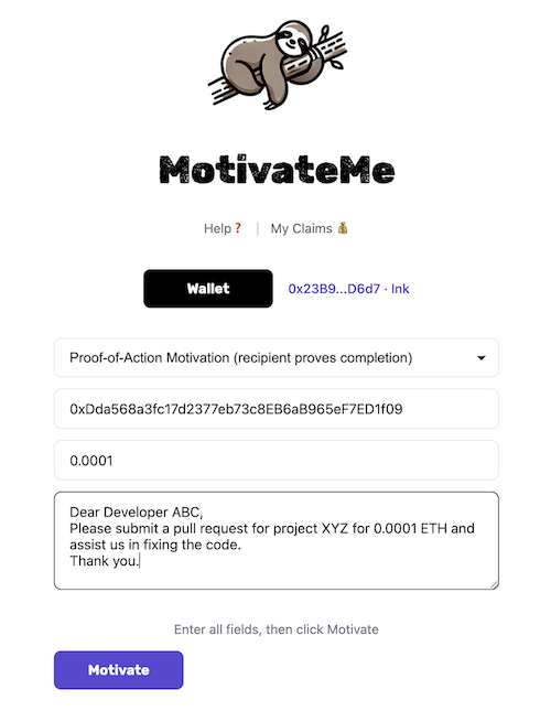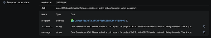 - Sender stores the motivation on the blockchain requesting execution from a particular (recipient’s) wallet address 0xDda568a3fc17d2377eb73c8EB6aB965eF7ED1f09: