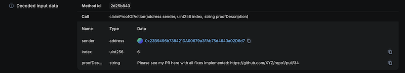 In our case, the proof is socially enforced, meaning there is no automated validation on-chain. However, in a more advanced implementation, this could be extended with programmatic validation within the dApp or through dedicated Oracles.