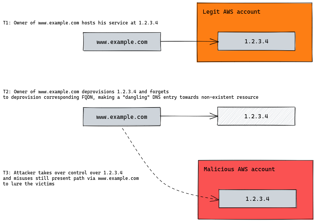 The domain www.example.com points to an IP address of an EC2 instance in AWS cloud. In case we deprovision our server, IP address can be released for completely different customer. New owner of the IP address can create own DNS records (e.g. www.newcustomer.com) pointing again to 1.2.3.4. The problem emerges, when the owner of www.example.com does not deprovision his original DNS record and still keeps parallel path to the somebody else’s server. This is also called “dangling” DNS record. In case 1.2.3.4 is adopted by a malicious actor, bad things can happen.