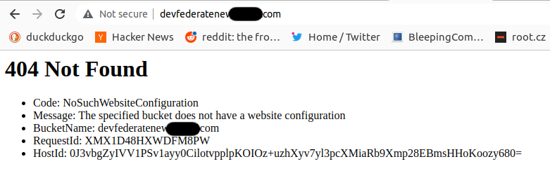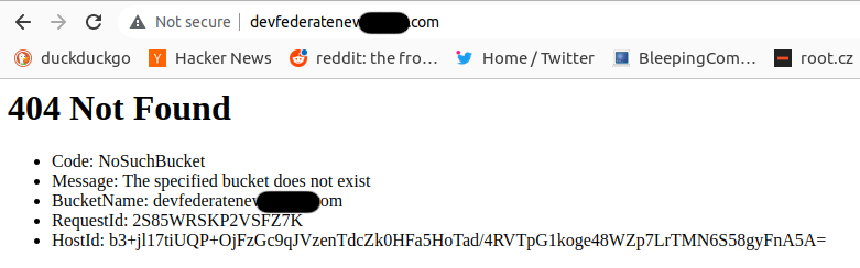 Seems as if devfederatenew.bluepill.com subdomain points to blank-page.com S3 bucket and applies static website redirection rules to redirect traffic to external S3 bucket. And this time to the non-existent S3 bucket devfederatenew.bluepill.com as indicated directly by the BucketName field in the error message: