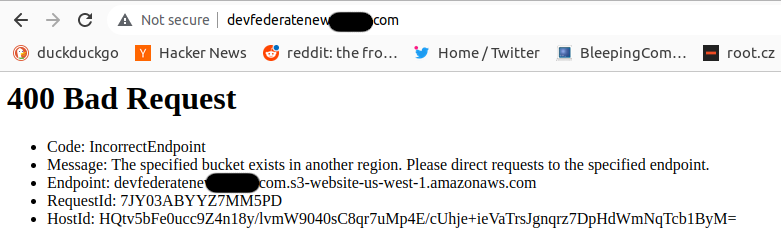 Now the bucket is created in the correct Region and we are getting promising 404 error indicating that we have just minor bucket configuration problem to resolve: