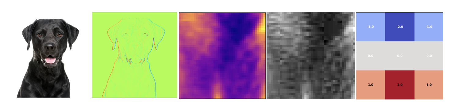 Various machine learning functions, e.g. convolutions may represent or encode the dog and dog parts as follows: