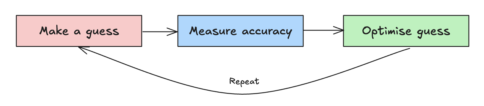 Then we check how good the guess was. Then we guess again, but better this time. We repeat this process in a loop, gradually improving our guesses until the model is accurate enough.