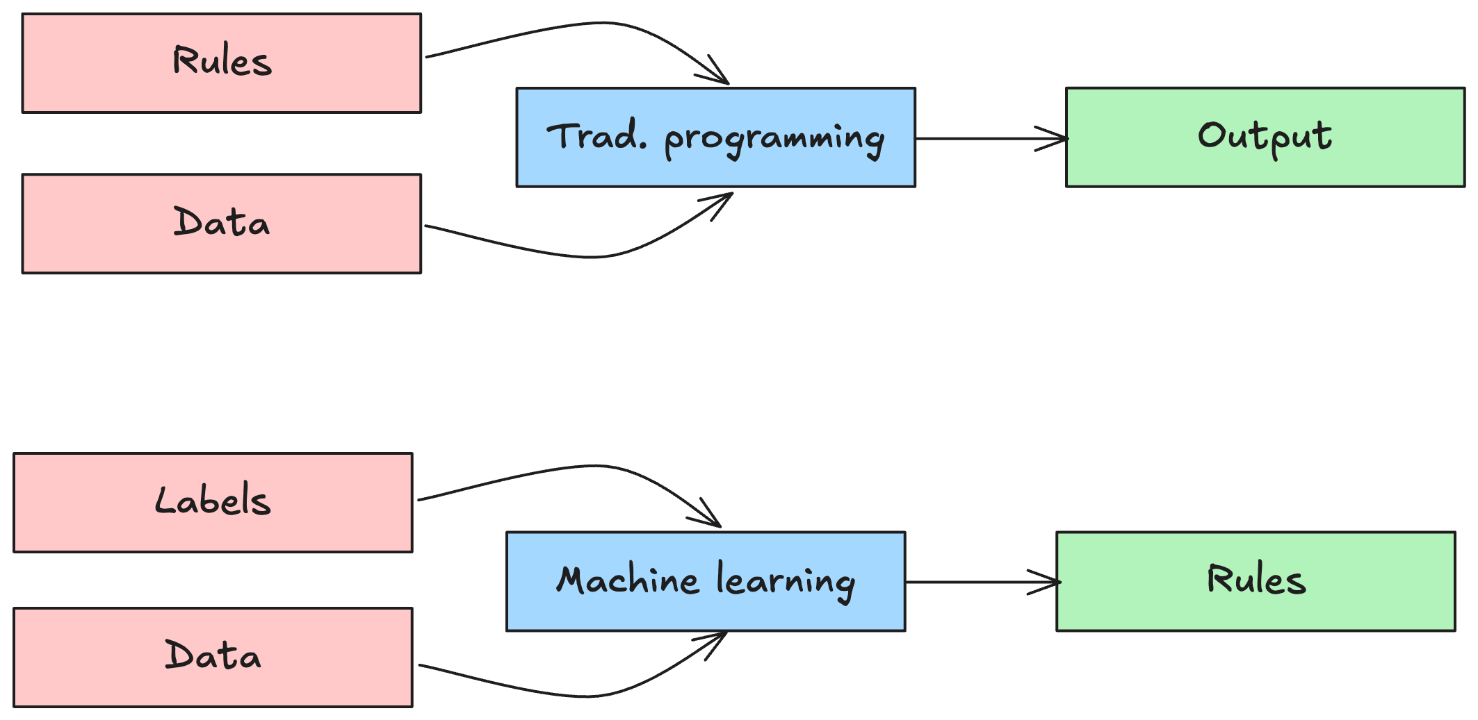 On contrary, machine learning has no exact algorithms and outcome is not precise. So why to bother? Machine learning shines when writing rules and algorithms would be overly complex if not impossible to define. E.g. to distinguish dog from a cat or to detect sarcasm in the sentence. Instead of giving the machine rules, we give it examples, lots of them, and let it figure out the patterns. We don’t program the model, we teach it to approximate outcome from a given input.