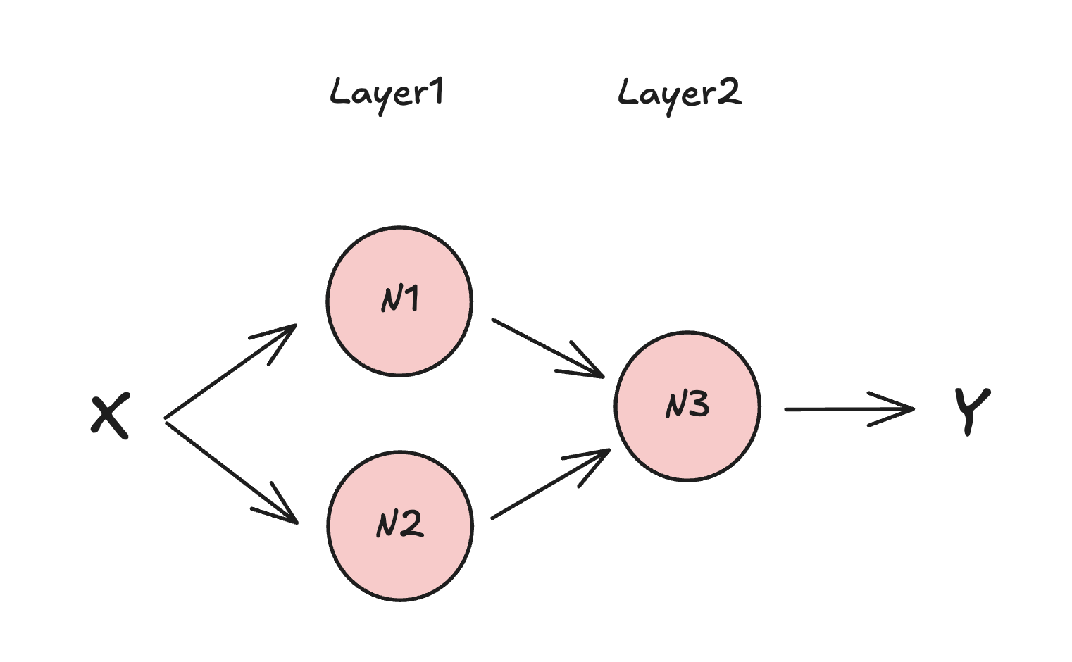 The diagram below illustrates a simple neural network with two layers and three neurons in total. The same input X is passed to both neurons in the first layer. These neurons process the input and forward their results to the second layer, where a single neuron performs the final computation, typically involving loss detection and calculation, to produce the output Y.
