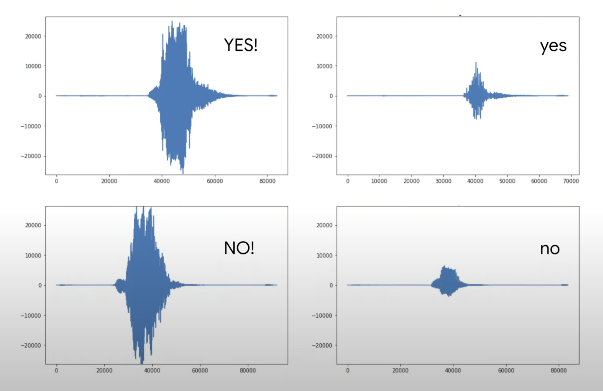 It is not enough to simply record audio samples and analyze the raw waveforms by looking at their amplitudes or shapes. Even very different words—like “yes” and “no” can appear surprisingly similar when represented as basic sound waves. Without proper preprocessing, the model may struggle to reliably distinguish them.